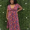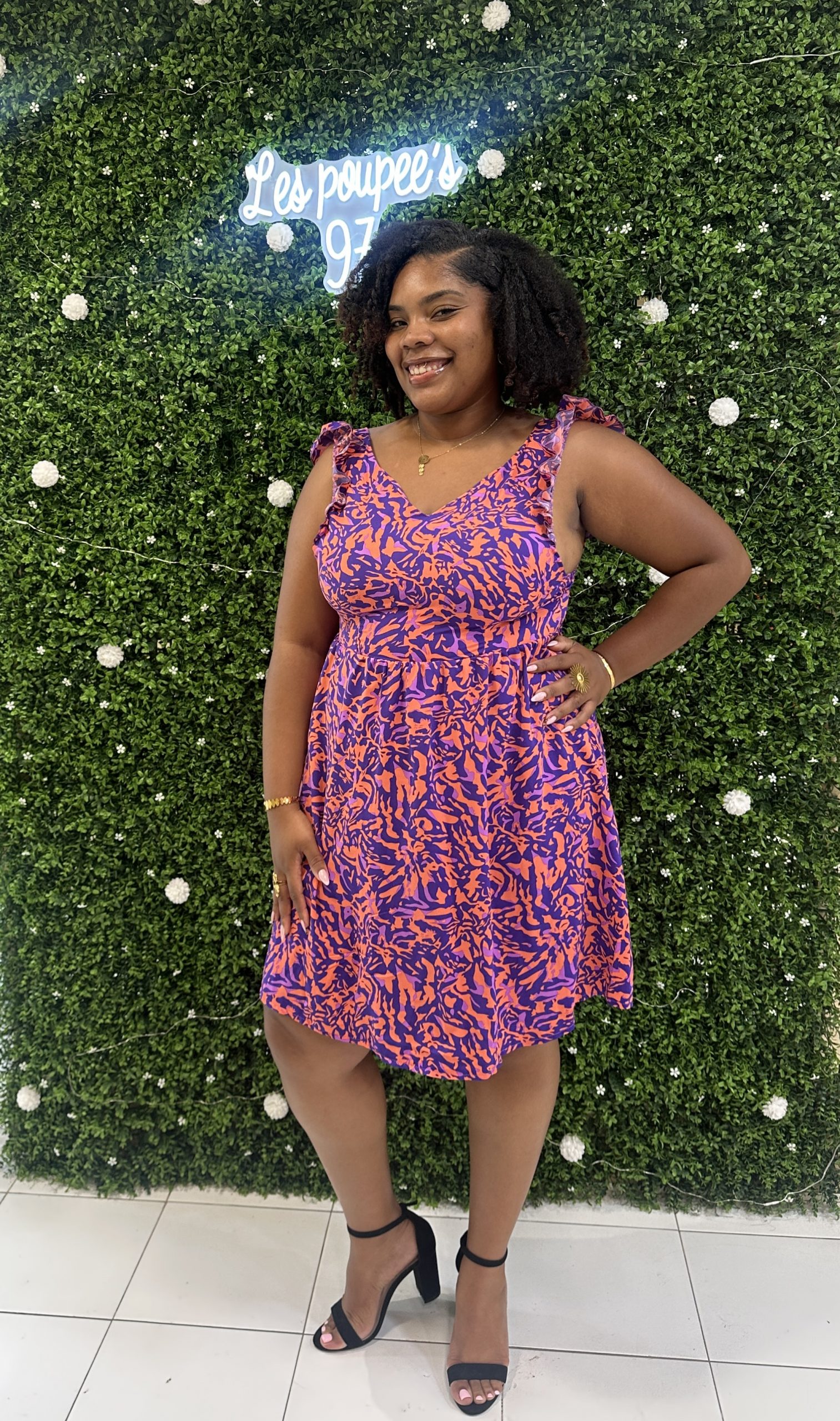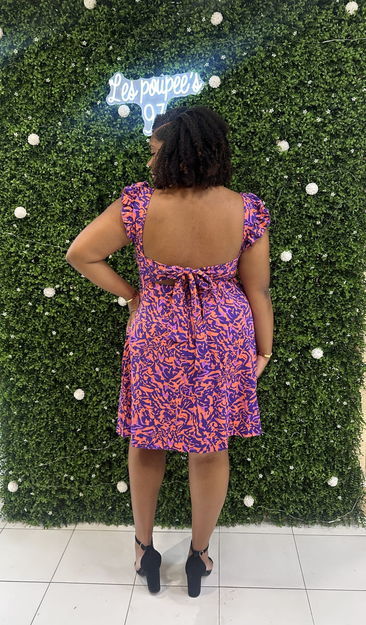 Robe courte décolleté les poupées 97 dos nu noué à motif violet et orange