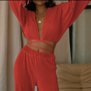 Ensemble pantalon et crop top cache cœur à manche longue rouge SEXY à retrouver chez les poupée’s97