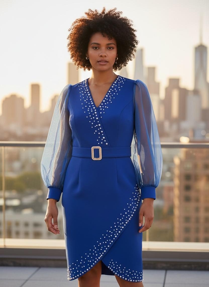 Robe près du corps BROOKLYN  bleu roi perlée, col V et manches bouffantes transparentes à retrouvez chez les poupée’s 97